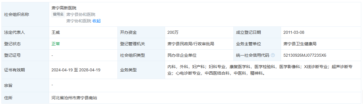 天眼查显示,肃宁高新医院(曾用名肃宁县协和医院、肃宁协和医院)成立于2011年3月8日,法定代表人王威,地址位于河北省沧州市肃宁县南站,注册资金200万。